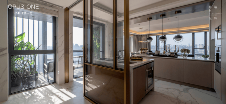 这客厅既是270°全景舱厅,无论全家在餐桌前欢聚一堂,还是孩子们在客厅嬉戏,一抬头便是以江景和城市为主题的巨幅油画。